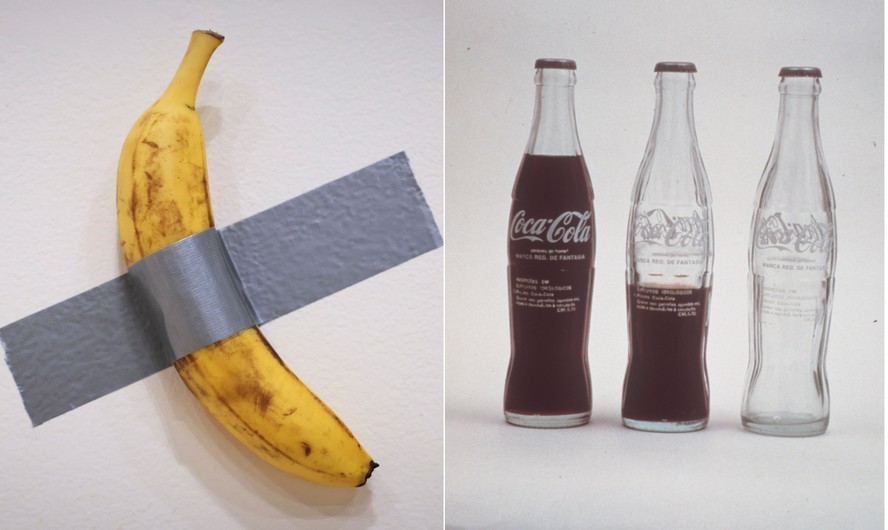 'Comedian',do italiano Maurizio Cattelan,e 'Inserções em circuitos ideológicos',do brasileiro Cildo Meireles — Foto: Fotos de Kena Betancur/AFP e divulgação