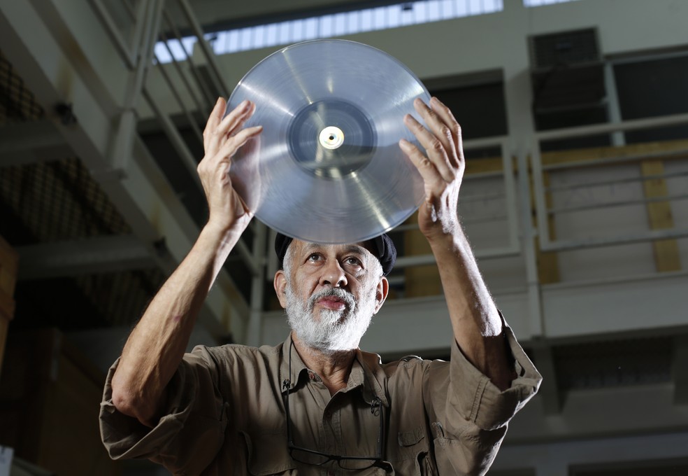 Cildo Meireles e uma de suas obras sonoras,em seu ateliê — Foto: Fabio Rossi