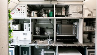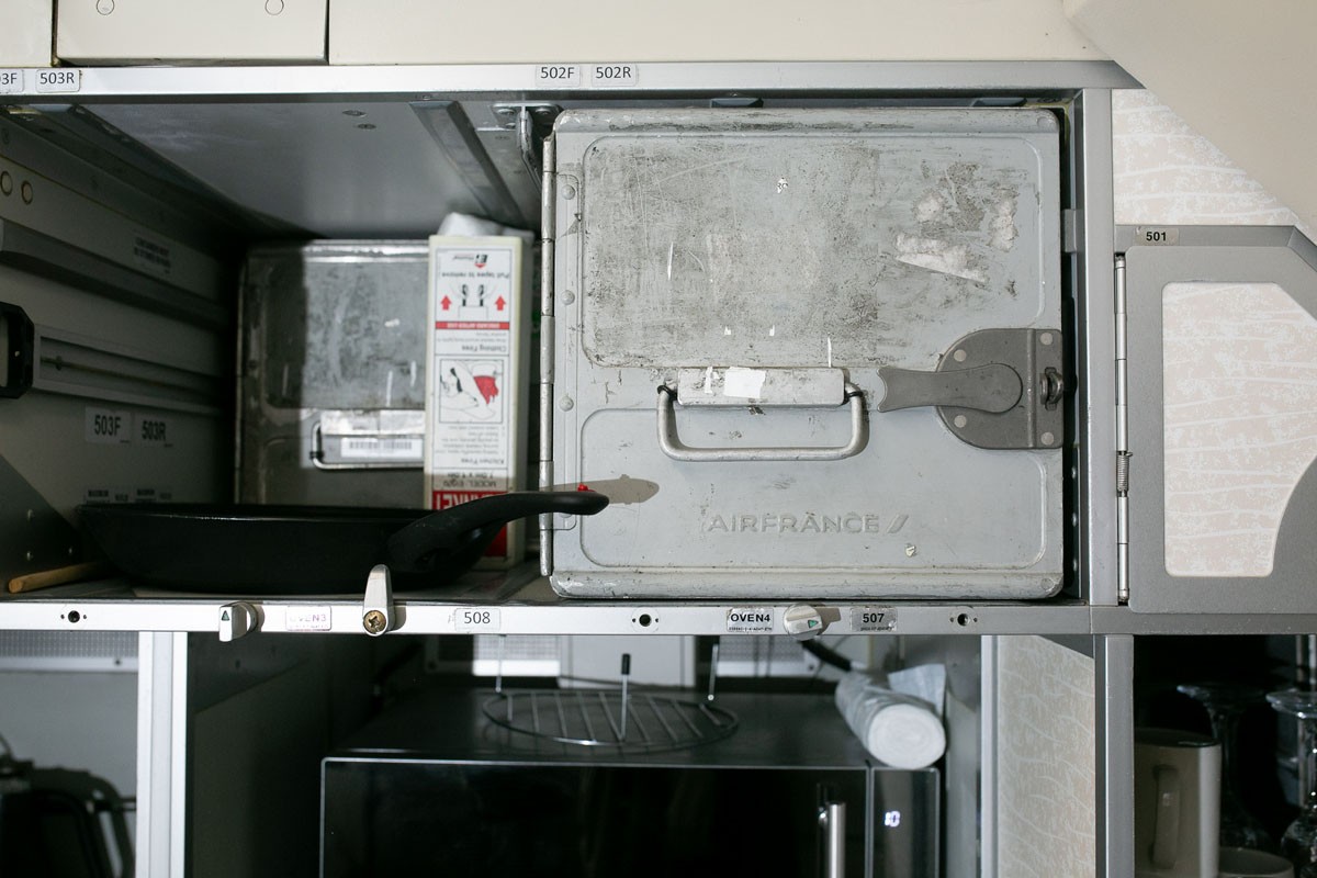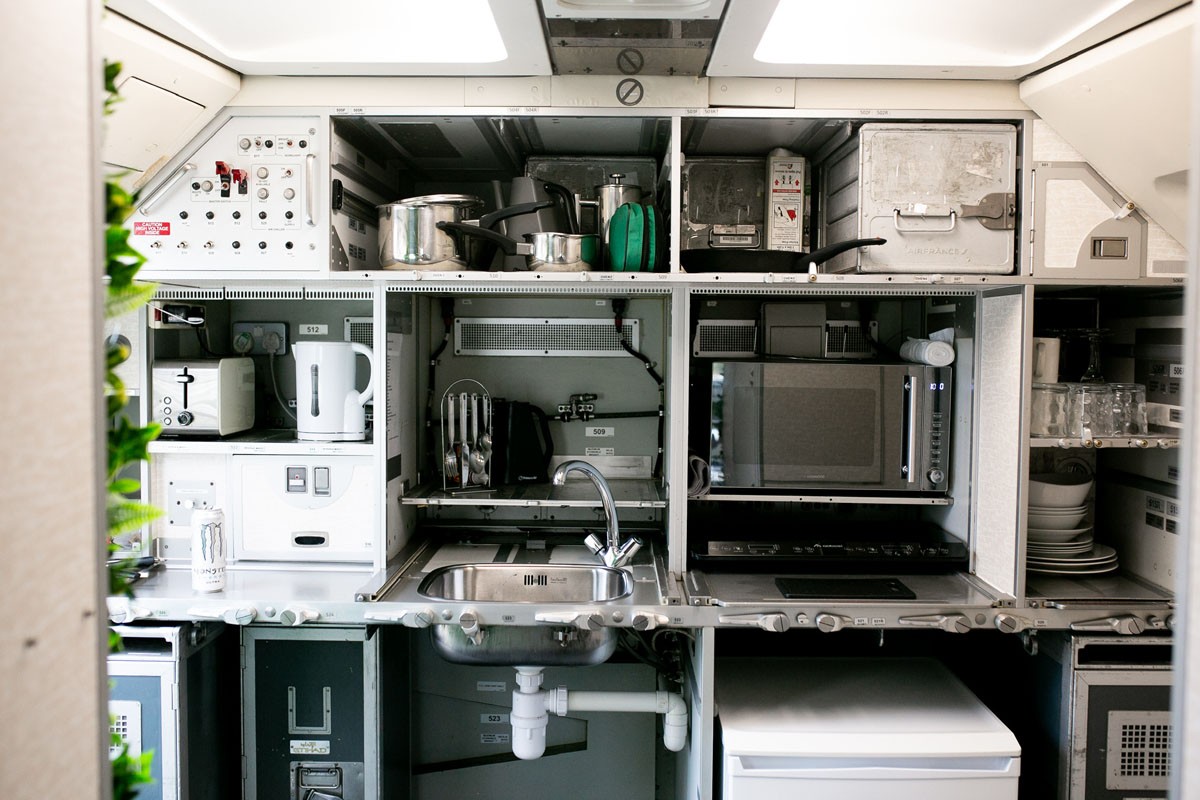 Caixa da Air France pode ser vista na cozinha do antigo avião,que fez parte da frota da Etihad — Foto: Reprodução / Apple Camping