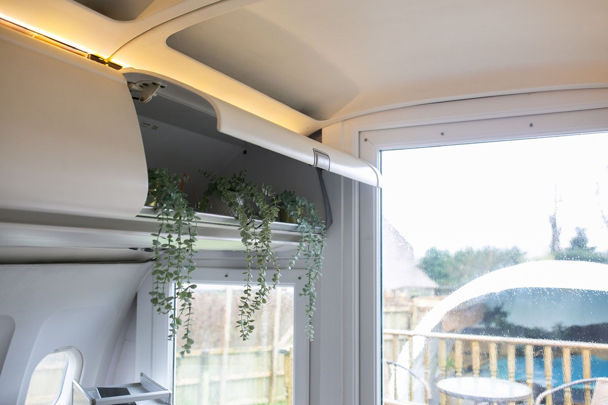 Plantas ocupam o lugar das malas nos compartimentos superiores do avião desativado — Foto: Reprodução / Apple Camping