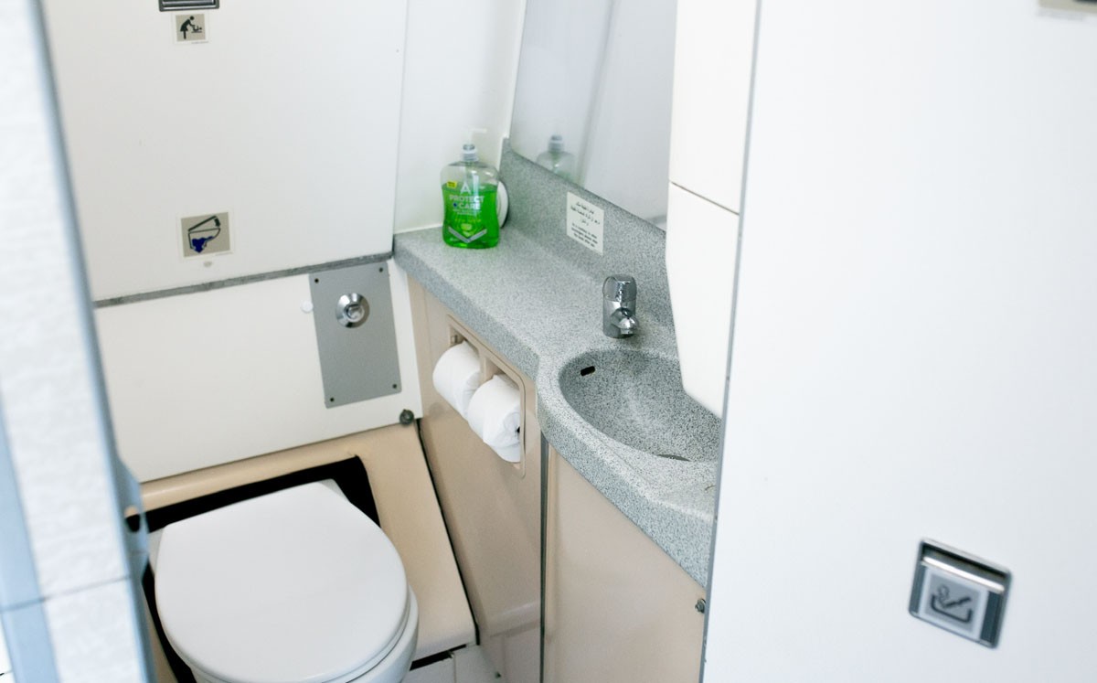 O banheiro do avião desativado foi adaptado,mas continua apertado — Foto: Reprodução / Apple Camping