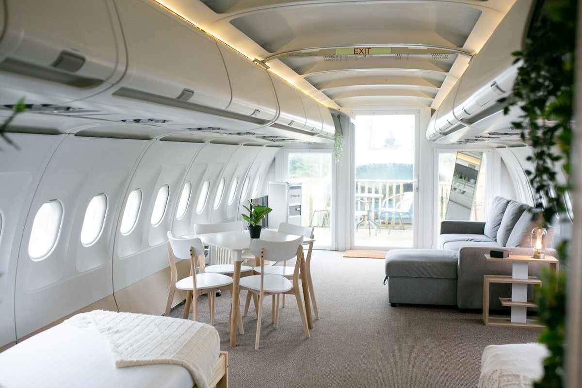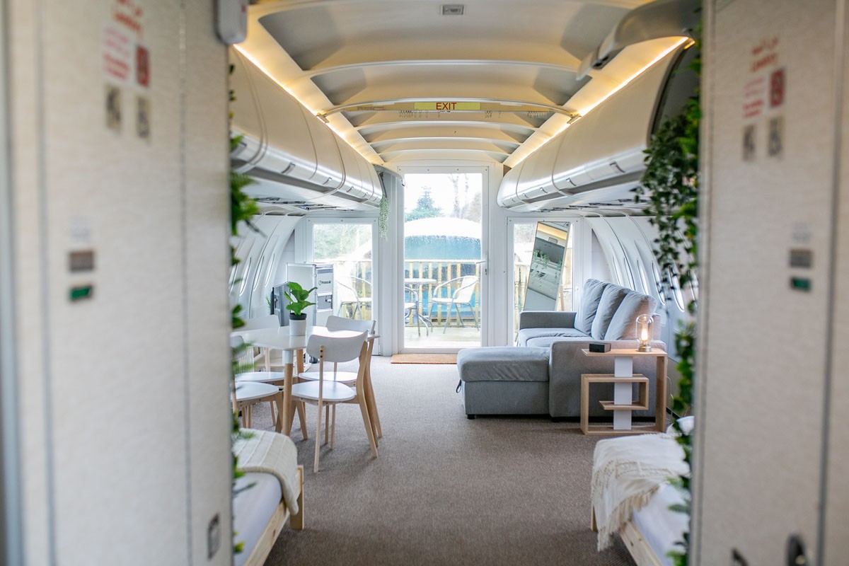 Vista do salão do Apple Airbus,opção de hospedagem criada a partir de um avião desativado,no Apple Camping,no País de Gales — Foto: Reprodução/ Apple Camping
