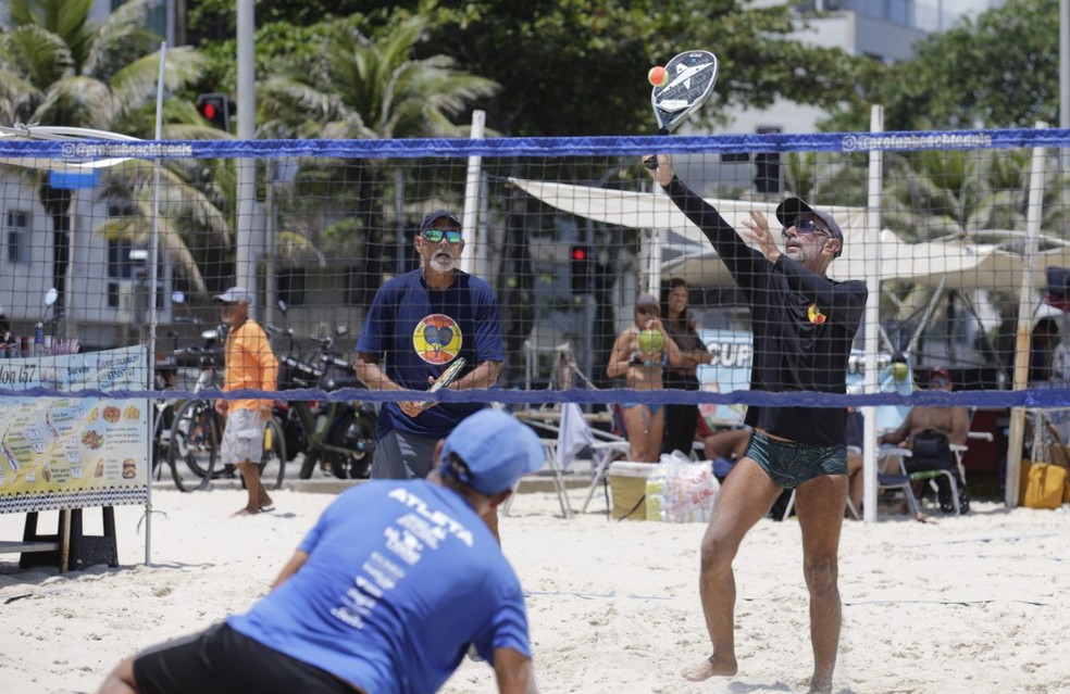 Longevidade: grupo de 60 a 80 anos se encontra às terças e quintas para jogar beach tennis na Praia do Leblon — Foto: Alexandre Cassiano