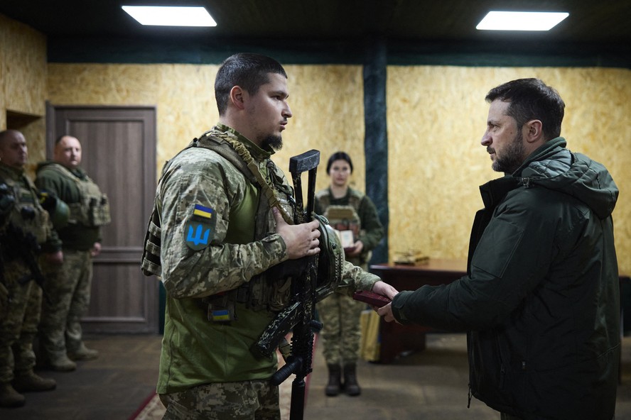 O presidente Zelensky (à direita) entrega uma condecoração a um soldado ucraniano em Kupyansk — Foto: AFP