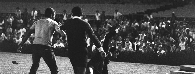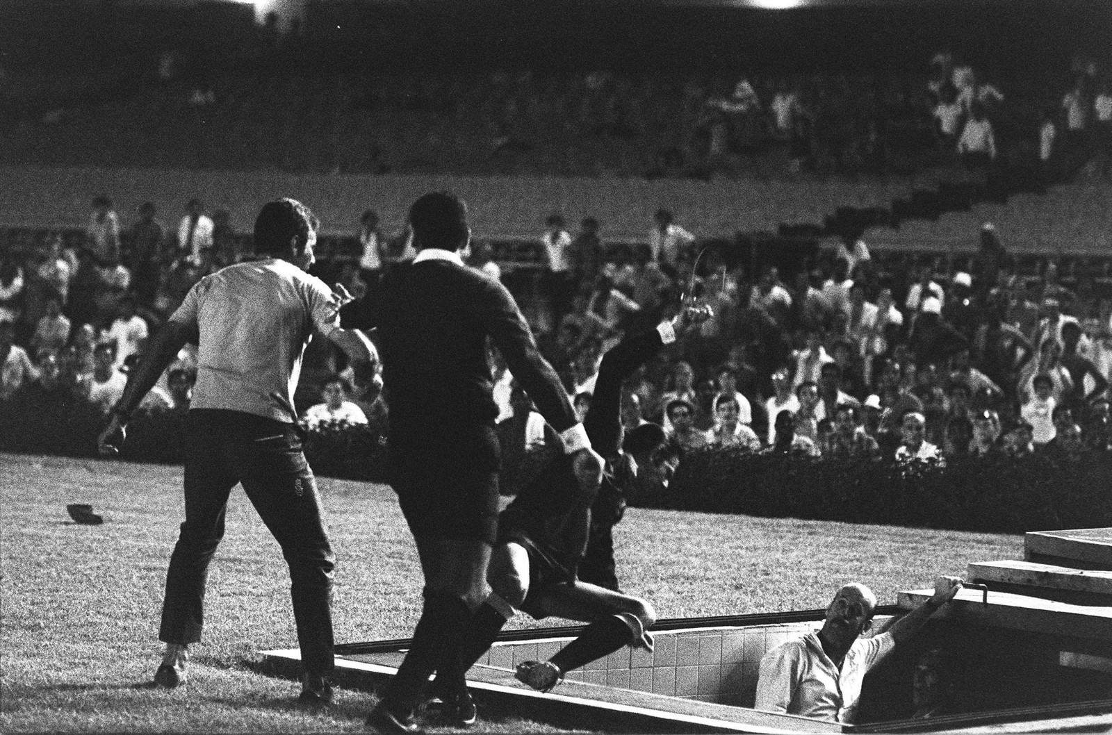 Insatisfeito com a atuação do árbitro Armando Marques,no jogo entre Atlético Mineiro x Botafogo,o ex-zagueiro do Botafogo e da Seleção Brasileira,Nilton Santos,agride o juiz na boca do túnel. Armando desaba escada abaixo — Foto: José Santos / Agência O Globo