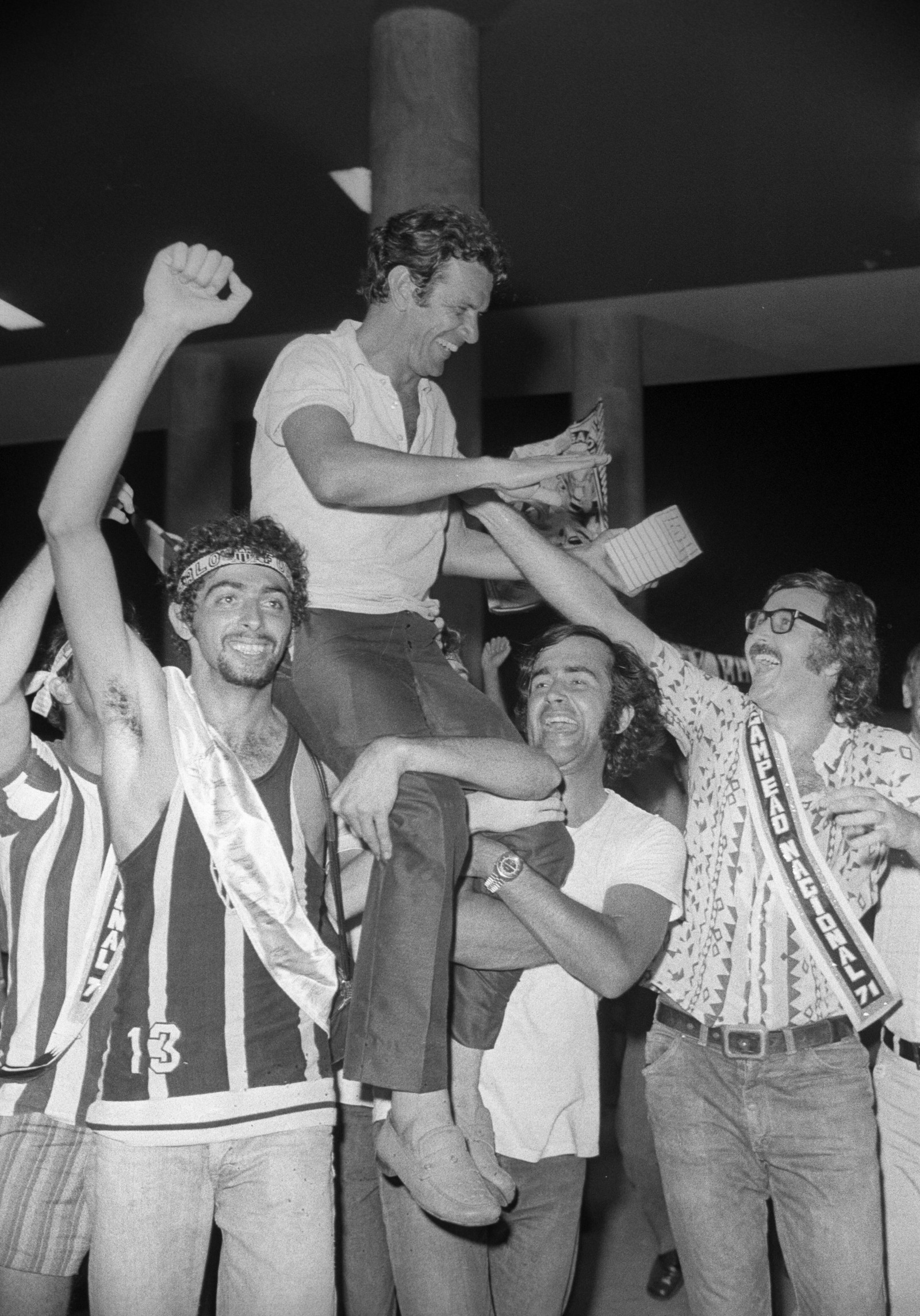 O técnico Telê Santana é recebido com festa pelos torcedores no Aeroporto da Pampulha,após a conquista do Campeonato Brasileiro — Foto: Arquivo / Agência O Globo