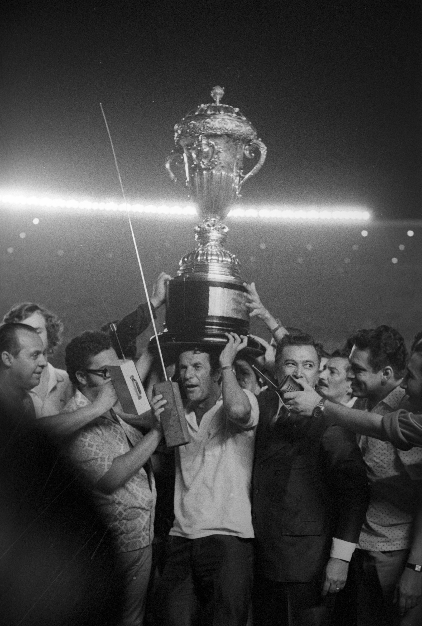 O técnico do Atlético,Telê Santana,foi merecidamente festejado,na foto carregada a grande Taça — Foto: Arquivo / Agência O Globo
