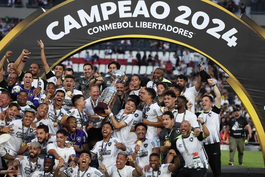 Equipe do Botafogo recebe a taça de campeão da Libertadores — Foto: ALEJANDRO PAGNI / AFP