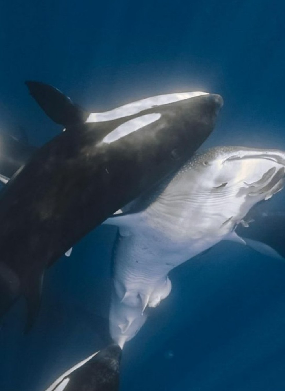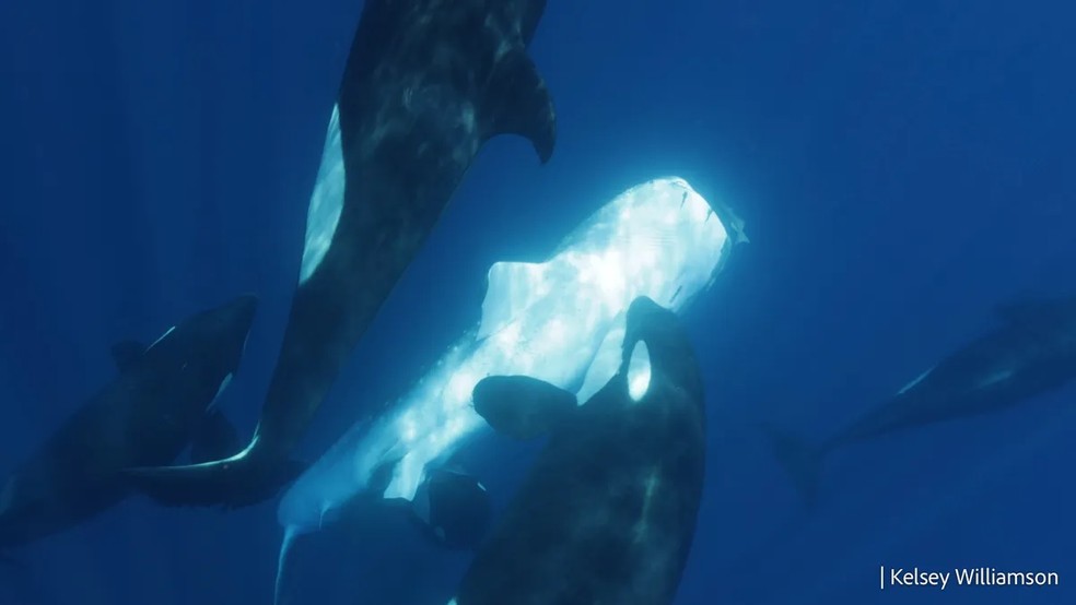 Registros mostram técnica usada por orcas para atacar tubarões-baleia — Foto: Kelsey Williamson