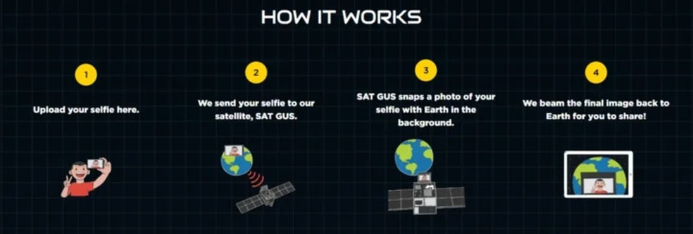 A ideia é que qualquer pessoa possa tirar uma selfie,a partir do espaço,com a sua localização geográfica em plano de fundo. Se o participante disser onde mora ao enviar sua foto,quando o satélite passar por cima dessa localização a selfie será tirada. A pessoa recebe uma notificação para saber exatamente quando a foto vai ser tirada.