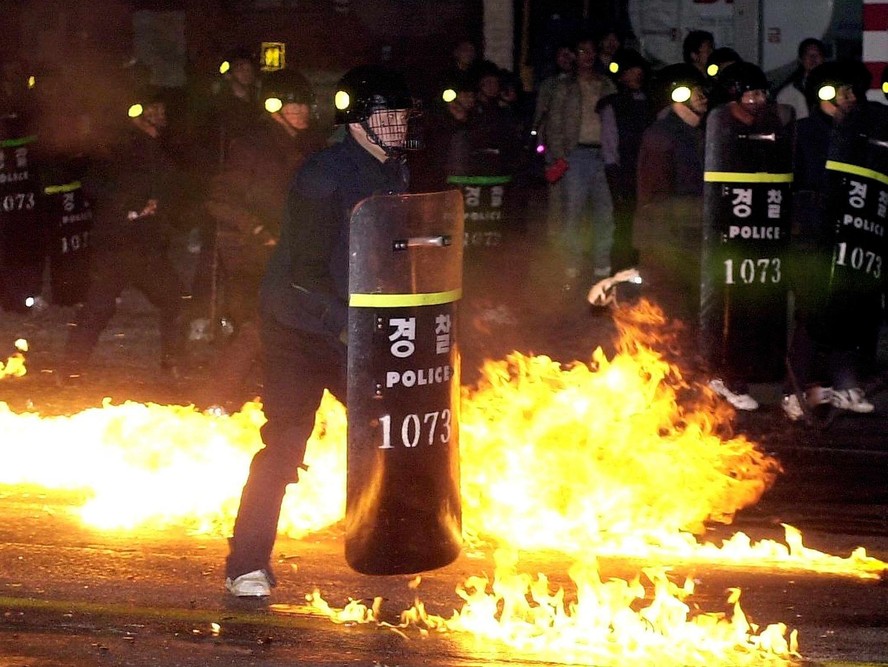 Policial é atingido por coquetéis molotov durante protesto no Dia do Trabalho em Seul — Foto: KIM JAE-HWAN/AFP PHOTO