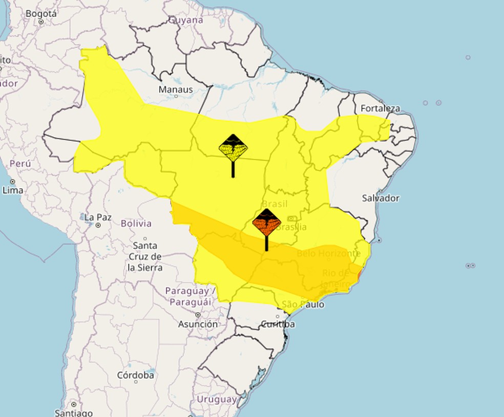 O alerta laranja,de 'Perigo' tempestades,atinge uma faixa que passa por Mato Grosso,Minas Gerais,São Paulo,Mato Grosso do Sul,Rio de Janeiro,e Espírito Santo. O aviso representa chuvas entre 30 e 60 mm/h ou 50 e 100 mm/dia e ventos intensos de 60 a 100 km/h,com queda de granizo,risco de corte de energia elétrica,estragos em plantações,queda de árvores e alagamentos.