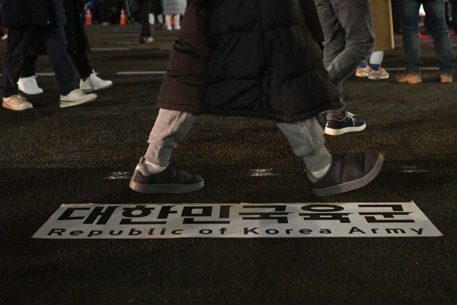 Pessoas pisam em placa do exército no chão enquanto se reúnem em frente à Assembleia Nacional em Seul,depois que o presidente da Coreia do Sul,declarou lei marcial — Foto: Anthony WALLACE / AFP