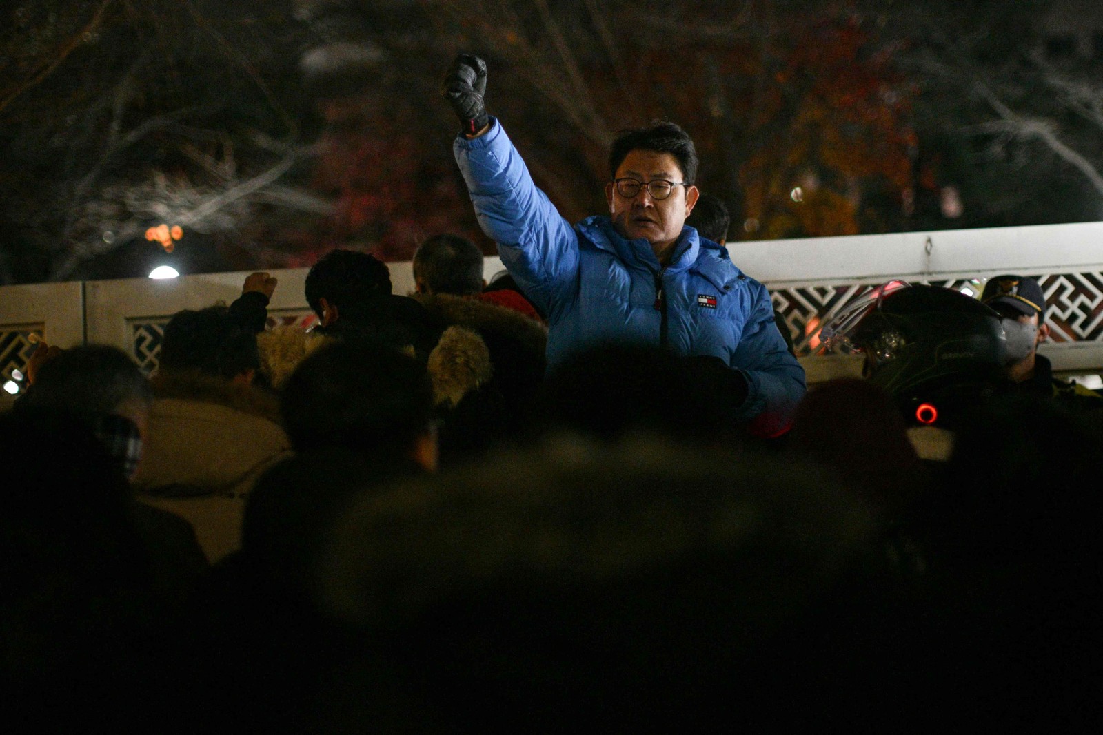 Lee Jae-myung,em pronunciamento após o presidente conservador Yoon Suk Yeol declarar lei marcial — Foto: Jung Yeon-je / AFP