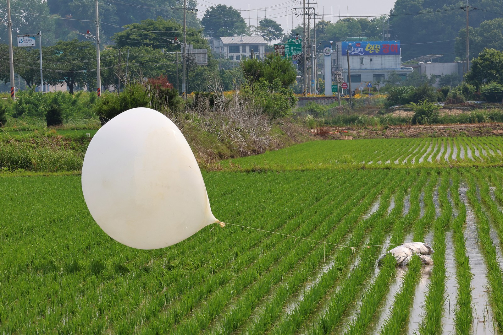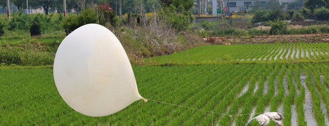 Balão lançado pela Coreia do Norte aterrissa em plantão de arroz de Incheon,território do Sul — Foto: YONHAP / AFP