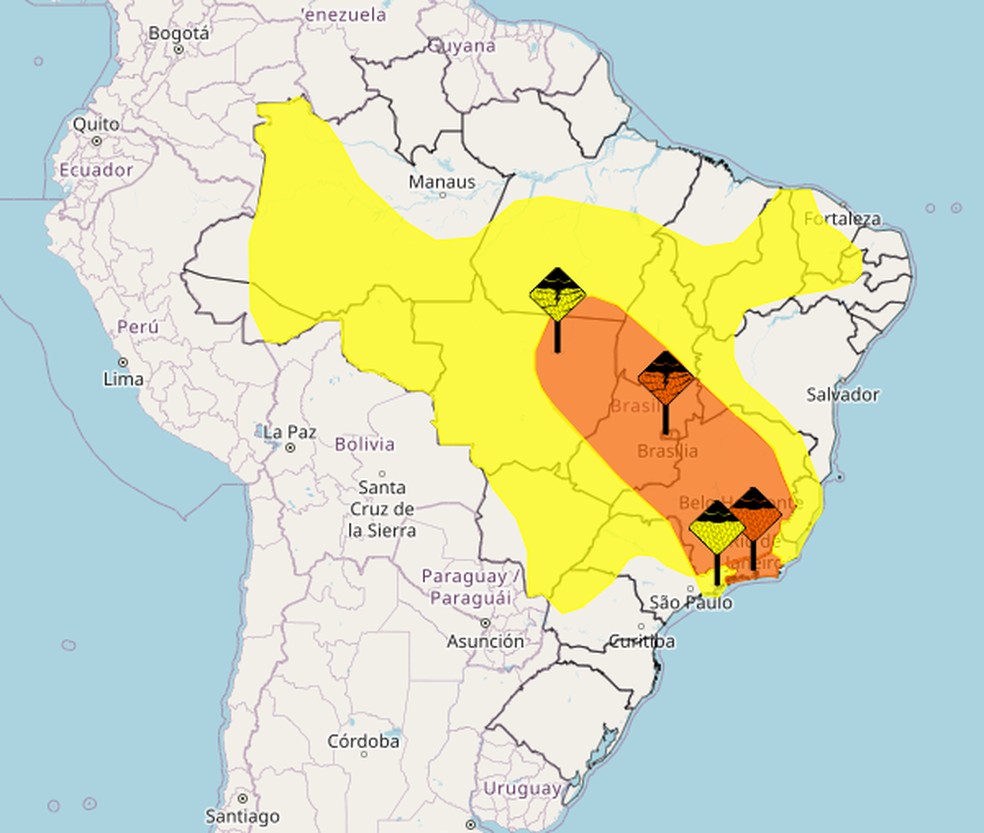 O alerta laranja,de 'Perigo' tempestades,atinge uma faixa que passa por Mato Grosso,Goiás,Minas Gerais,São Paulo,Rio de Janeiro,e o sul do Pará. O aviso representa chuvas entre 30 e 60 mm/h ou 50 e 100 mm/dia e ventos intensos de 60 a 100 km/h,com queda de granizo,risco de corte de energia elétrica,estragos em plantações,queda de árvores e alagamentos.