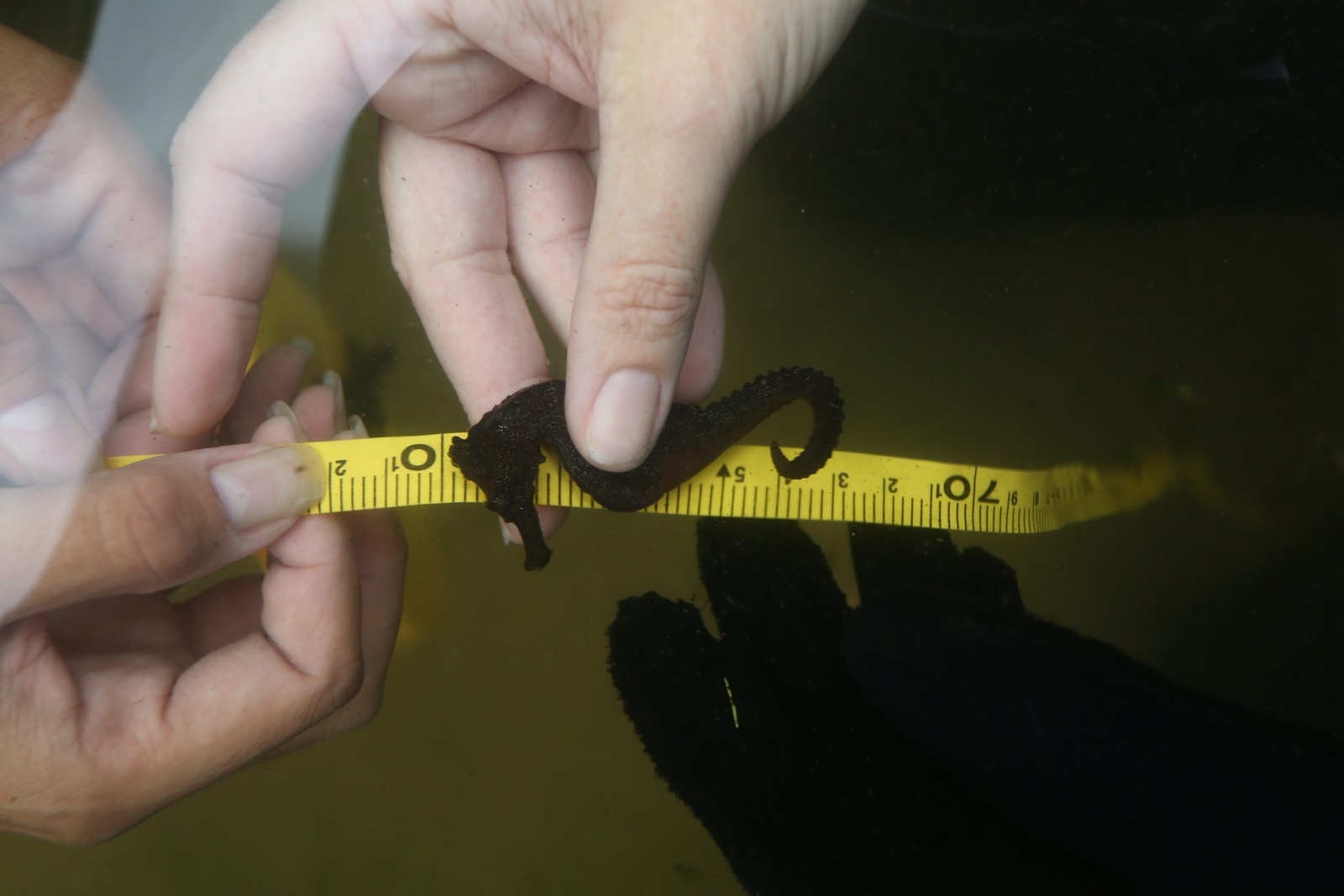 Pesquisadores medem um cavalo-marinho: na Baía de Guanabara,número de animais a cada 400 metros quadrados passou de dois para 13 em seis anosAgência O Globo