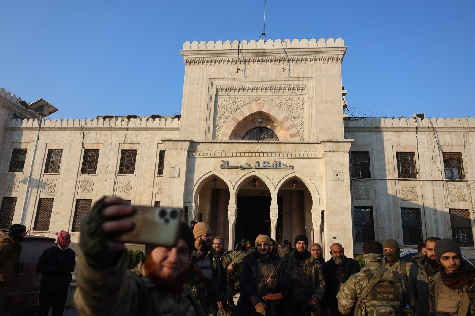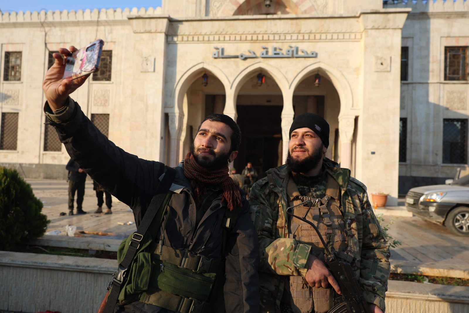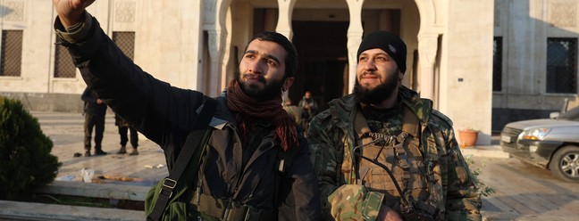 Rebeldes tiram 'selfie' em frente a prédio municipal na cidade de Hamã,na Síria — Foto: Mohammed AL-RIFAI / AFP
