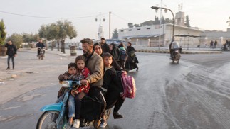 Família síria evacua a cidade de Hama após invasão de rebeldes — Foto: Bakr ALKASEM / AFP