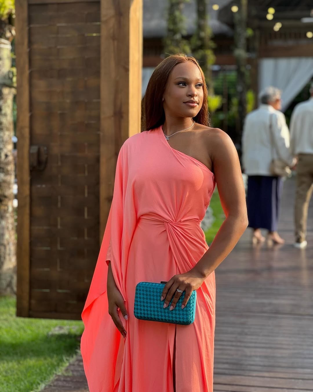 A ginasta Rebecca Andrade foi a um casamento com um vestido coral de drapeados,que ressaltou seu tom de pele — Foto: Reprodução/Instagram