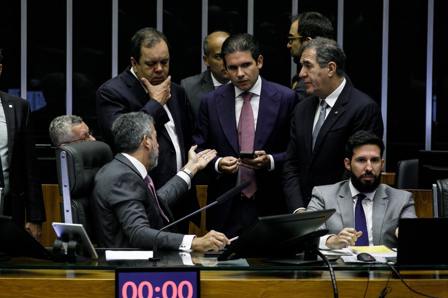 Plenário da Câmara dos Deputados presidida por Arthur Lira. Na foto: Hugo Motta e Elmar Nascimento. — Foto: Brenno Carvalho / Agência O Globo