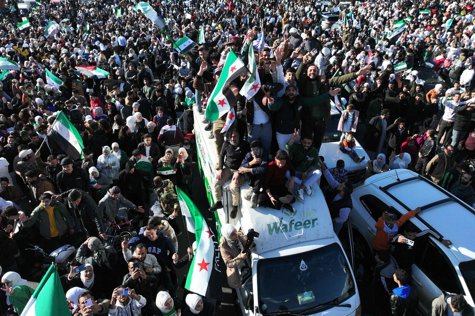 Sírios celebram a queda do governo de Assad — Foto: AAREF WATAD / AFP