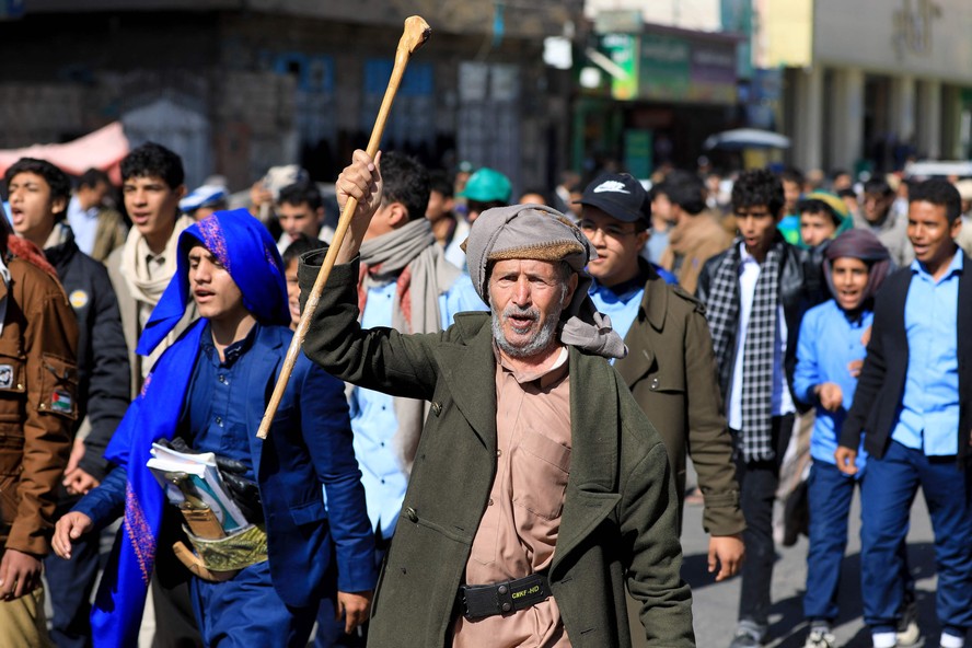 Apoiadores do movimento huthi do Iêmen fazem manifestação na capital,Sanaa,em apoio aos palestinos e contra EUA e Israel — Foto: Mohammed HUWAIS / AFP