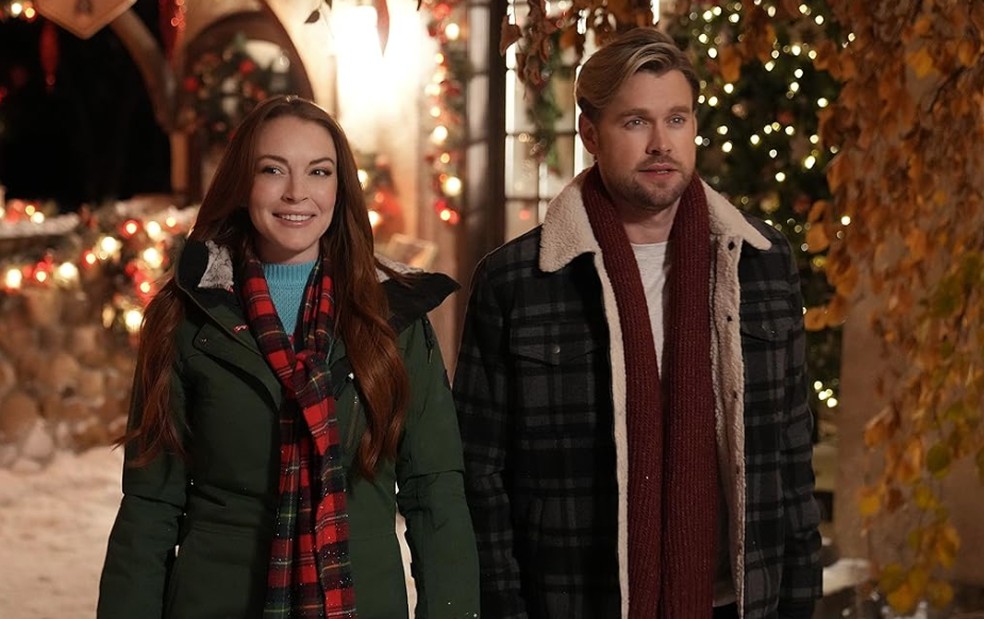 Lindsay Lohan e Chord Overstreet em 'Uma Quedinha de Natal' (2022) — Foto: Divulgação