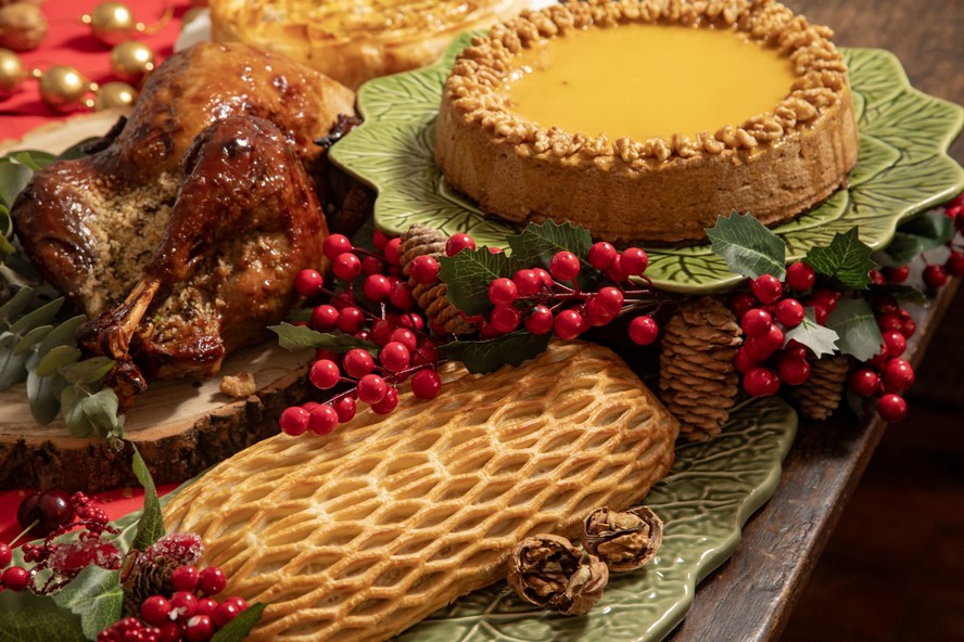 Entre os pratos principais,a rede prepara rosbife de filé com cogumelos,legumes e demi-glace (R$ 329,90) e porchetta recheada com filé suíno e especiarias,mais cebola caramelizada,batata e maçã assada (R$ 249,90). De doce,torta guirlanda de brownie de brigadeiro de laranja (R$ 119,90). Encomendas até quinta-feira (97901-6420). Entregas com taxa.