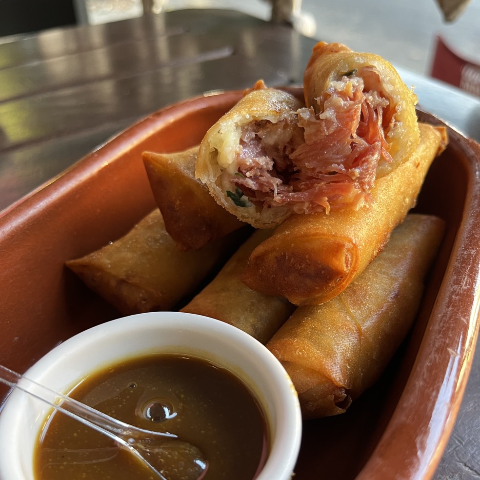 No menu,carne assada recheada com calabresa (R$ 135),bobó de camarão (R$ 155) e lascas de bacalhau com cebola,azeitona e purê (R$ 180) — todos para dois —,além do icônico porquinho de quimono (R$ 80,25 unidades),harumaki de costela e requeijão de ervas. Encomendas até domingo. Praça da Bandeira (97920-1055).
