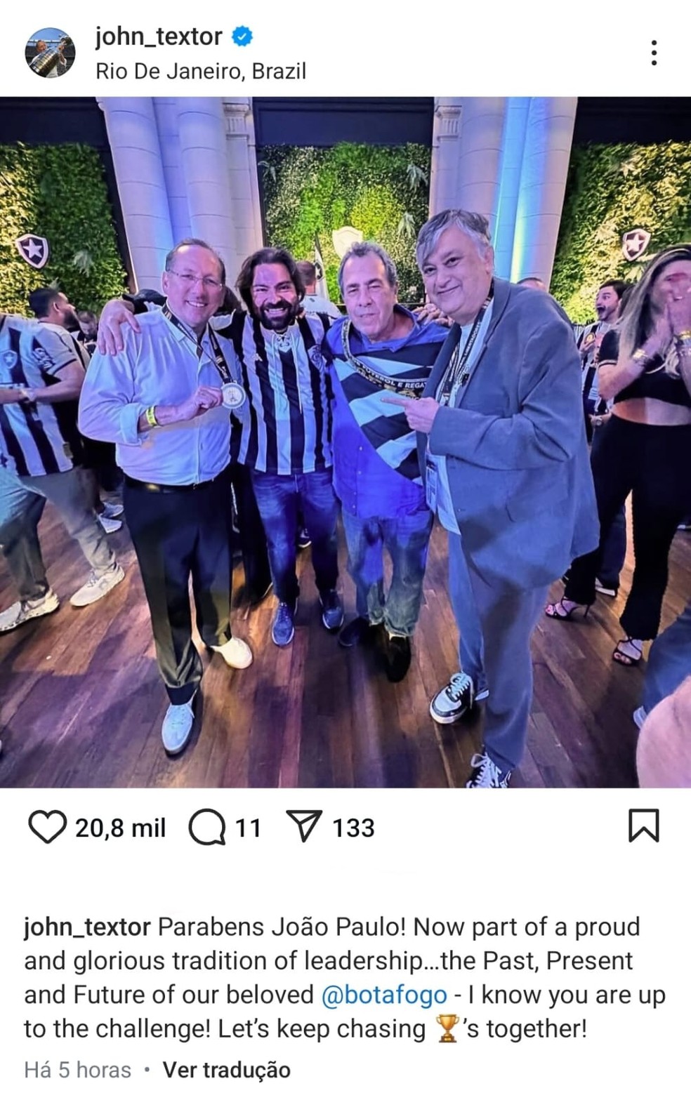 — Agora,você é parte de uma orgulhosa e gloriosa tradição de liderança. Passado,presente e futuro do nosso amado Botafogo. Sei que você está pronto para o desafio. Vamos continuar buscando troféus juntos — disse Textor,no Instagram em uma publicação incluindo uma foto com Carlos Augusto Montenegro,ex-presidente alvinegro,que apoiou a candidatura vencedora.