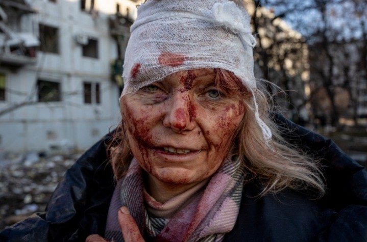 “Olena Curillo: Face da Guerra da Ucrânia”,do americano Wolfgang Schwan. Nela,uma mulher aparece em estado de choque e coberta de sangue depois que seu complexo de apartamentos foi atingido por um míssil russo — Foto: Wolfgang Schwan/Siena International Photo Awards