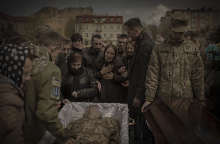 Outra menção honrosa foi para “Conflito na Ucrânia”,do francês Kiran Ridley. Nela,a mãe de um jovem soldado lamenta a morte do filho durante funeral realizado em abril do último ano em Lviv — Foto: Kiran Ridley/Siena International Photo Awards