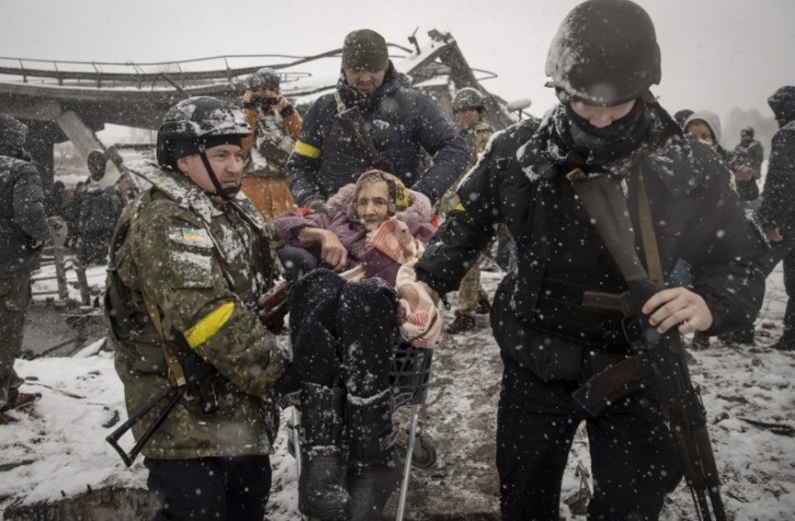 “Mulheres ucranianas no meio da guerra”,de Emin Sansar. Na imagem,uma mulher ucraniana idosa é resgatada — Foto: Emin Sansar/Siena International Photo Awards