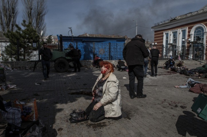 “Ataque russo à estação ferroviária de Kramatorsk”,de Andrea Carrubba. Nela,uma mulher ferida e com o rosto sangrando aparece de joelhos cercada por mortos e gravemente feridos em uma estação ferroviária — Foto: Andrea Carrubba/Siena International Photo Awards