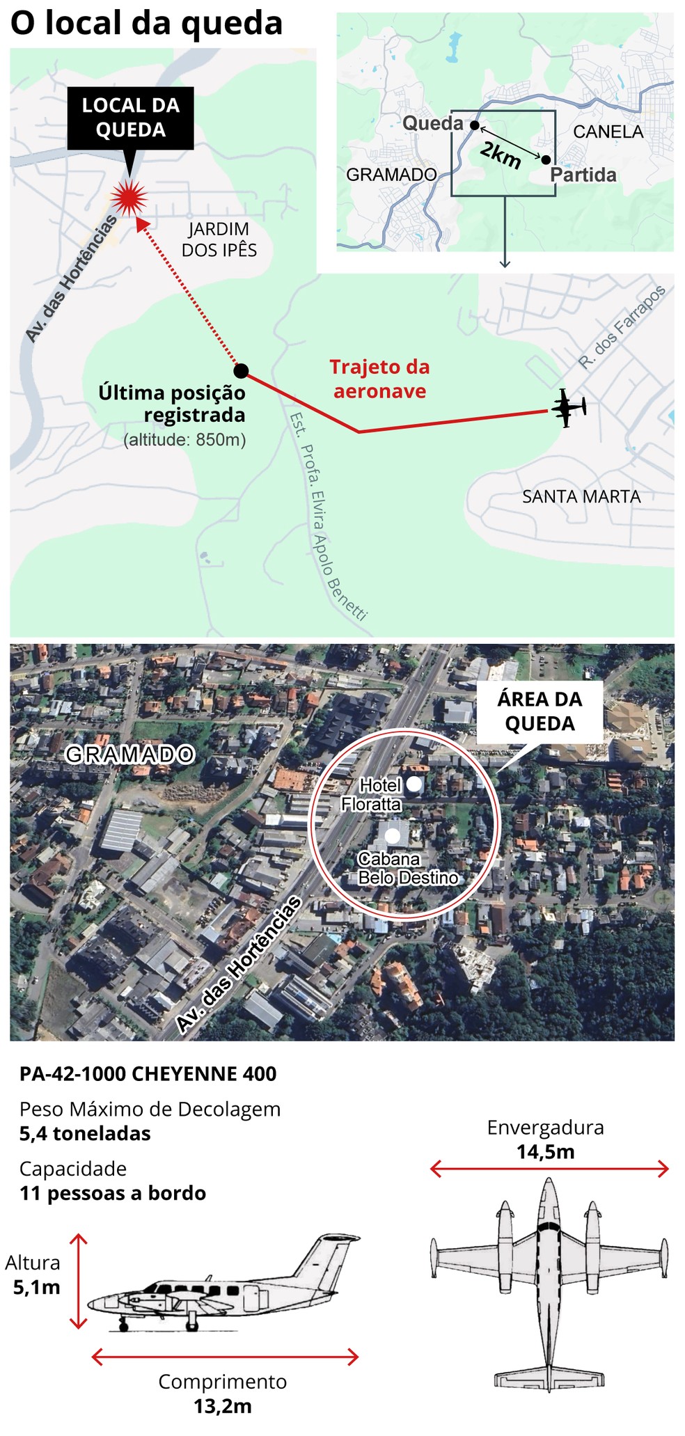 A aeronave Piper PA-42-1000 Cheyenne 400,um avião turboélice bimotor de pequeno porte,transportava dez pessoas quando caiu no centro de Gramado,na Serra Gaúcha,na manhã deste domingo. O modelo,fabricado em 1990 pela Piper Aircraft,atingiu uma construção e explodiu na Avenida das Hostênsias,dois quilômetros distante do local da sua decolagem,em Canela.