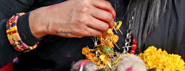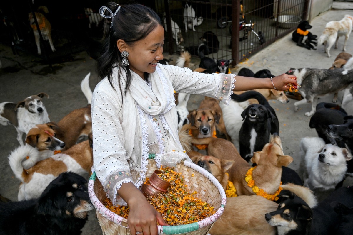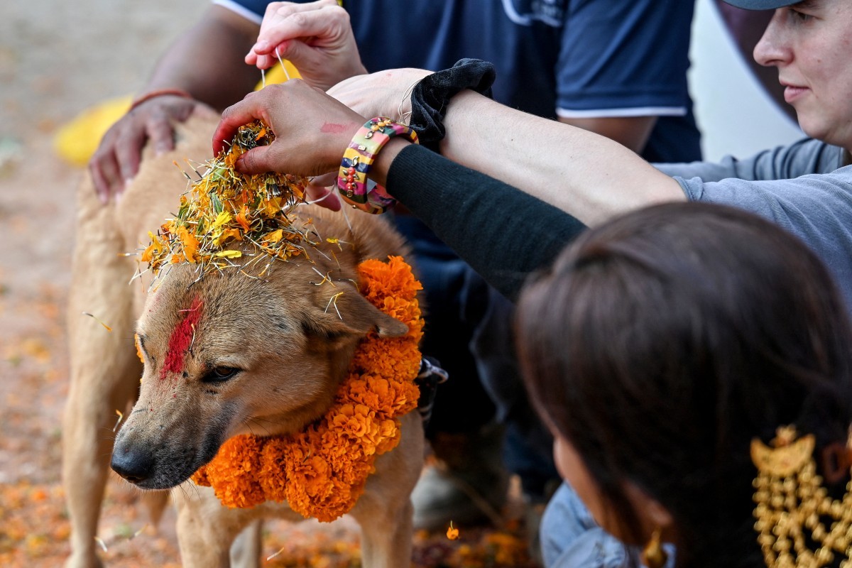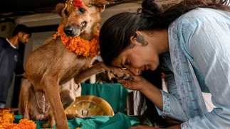Com guirlandas de calêndula em volta do pescoço,em um dia dedicado ao amigo leal da humanidade como parte de um festival hindu — Foto: PRAKASH MATHEMA / AFP
