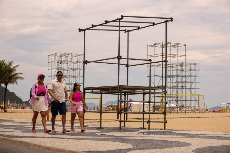 Só animação: Palco do réveillon em Copacabana dedicado ao samba terá formato de pandeiro; estruturas já estão sendo montadas na praia