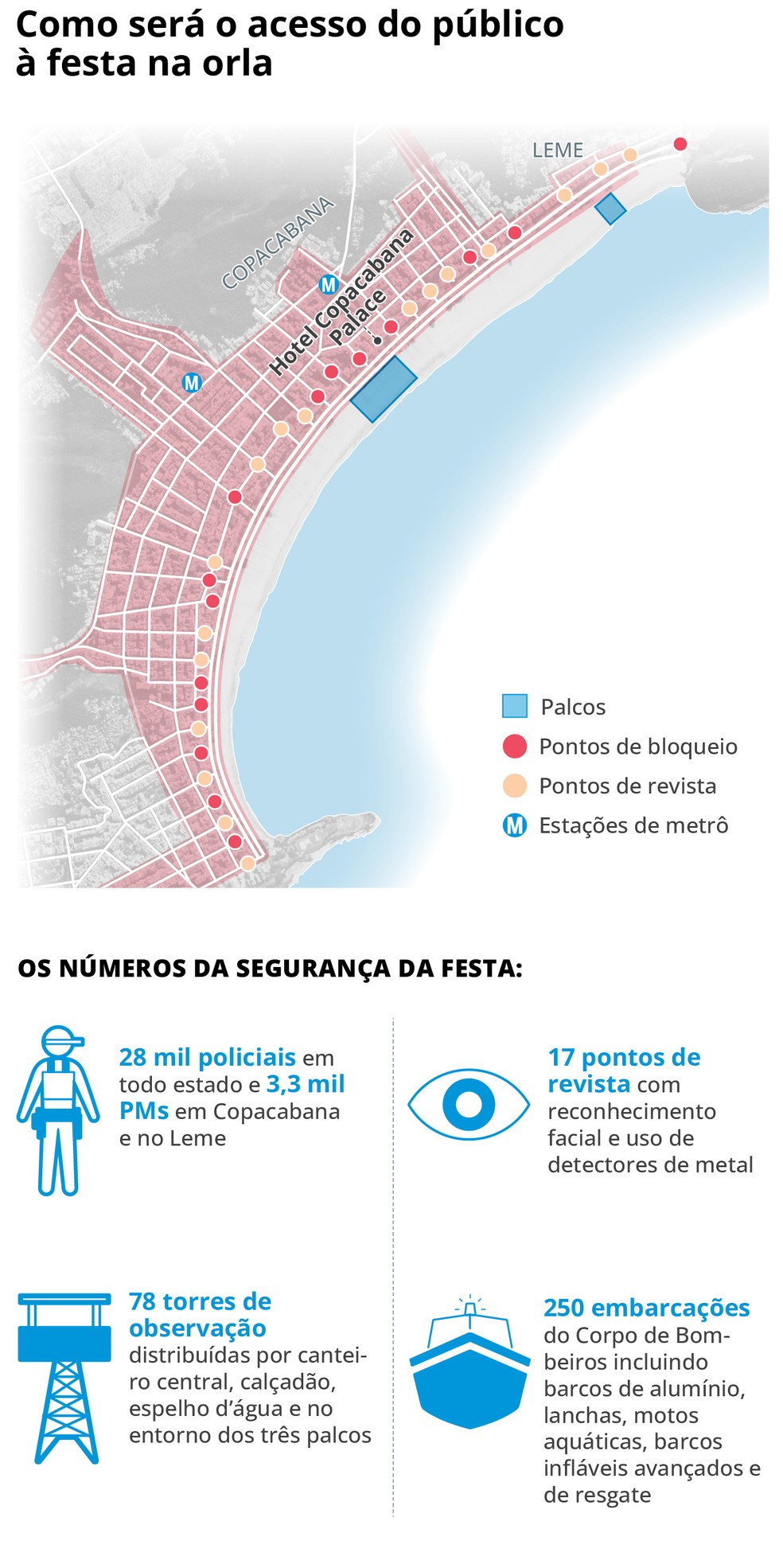 O número de policiais em Copacabana será 10% maior que o do último réveillon,sobretudo por causa do novo palco no Leme,que terá shows voltados para o público gospel. Também serão 18 torres de observação a mais na Avenida Atlântica e na areia,totalizando 78.