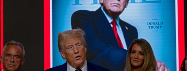 Sam Jacobs,editor-chefe da Time,escreveu na revista que a escolha não foi difícil: “No auge de sua segunda Presidência,todos nós — desde seus apoiadores mais fanáticos até seus críticos mais fervorosos — estamos vivendo na Era de Trump.” — Foto: SPENCER PLATT / GETTY IMAGES NORTH AMERICA / Getty Images via AFP