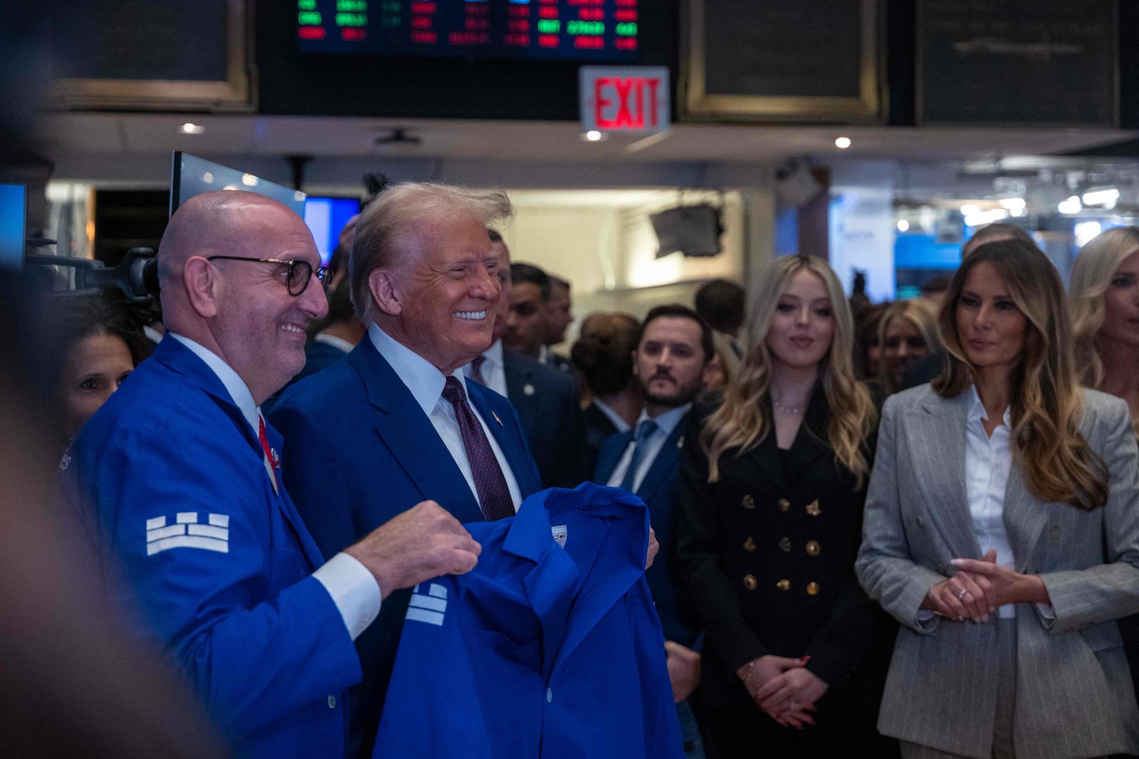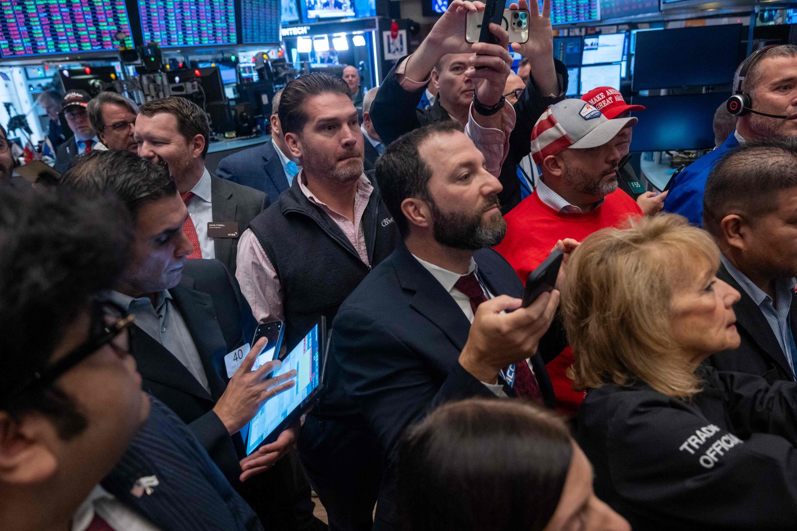 Investidores assistem Trump discursar na Bolsa de Valores de Nova York — Foto: SPENCER PLATT / GETTY IMAGES NORTH AMERICA / Getty Images via AFP