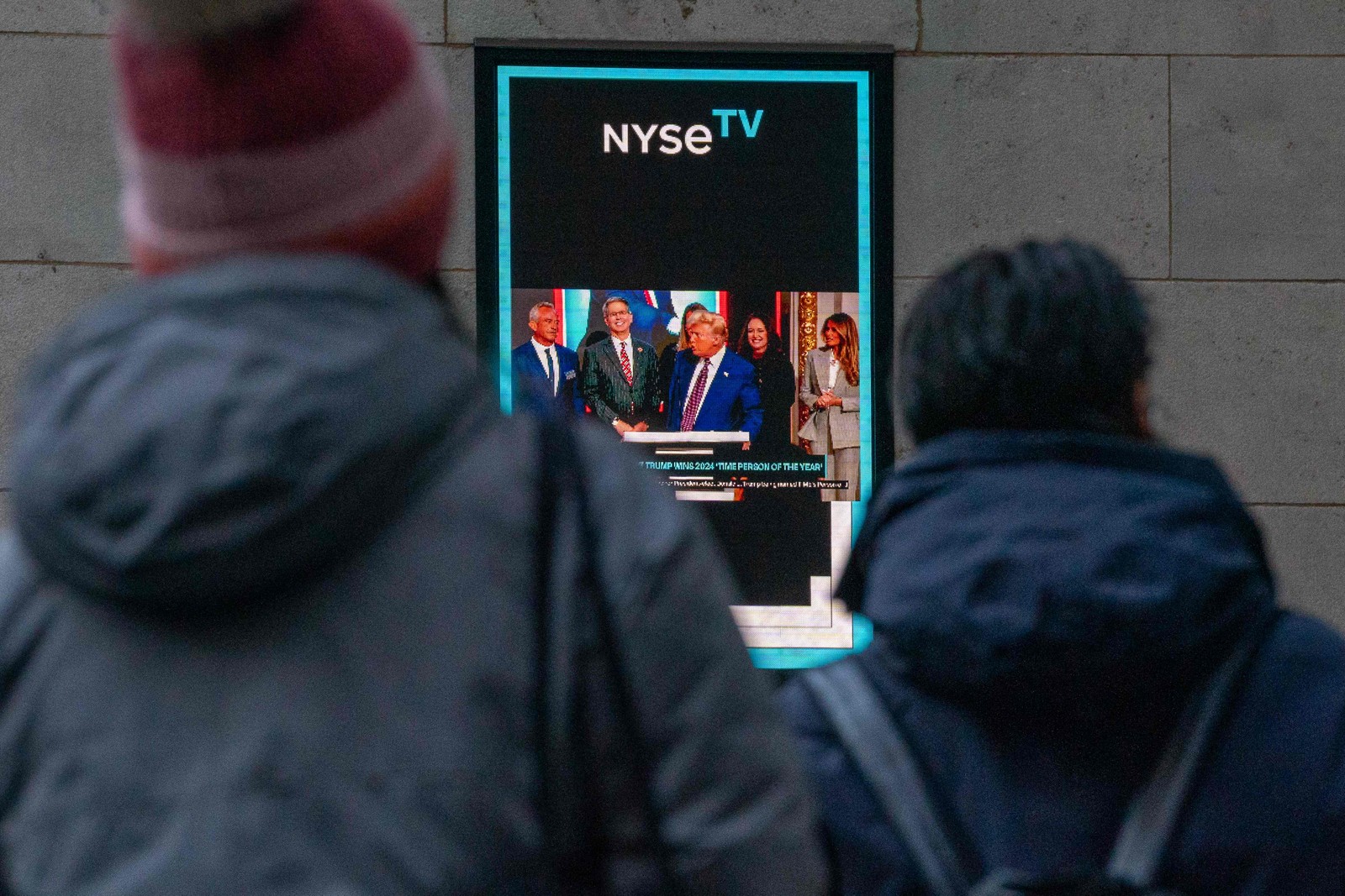 Pessoas assistem ao discurso do presidente eleito Donald Trump após ser escolhido como Pessoa do Ano — Foto: David Dee Delgado / AFP