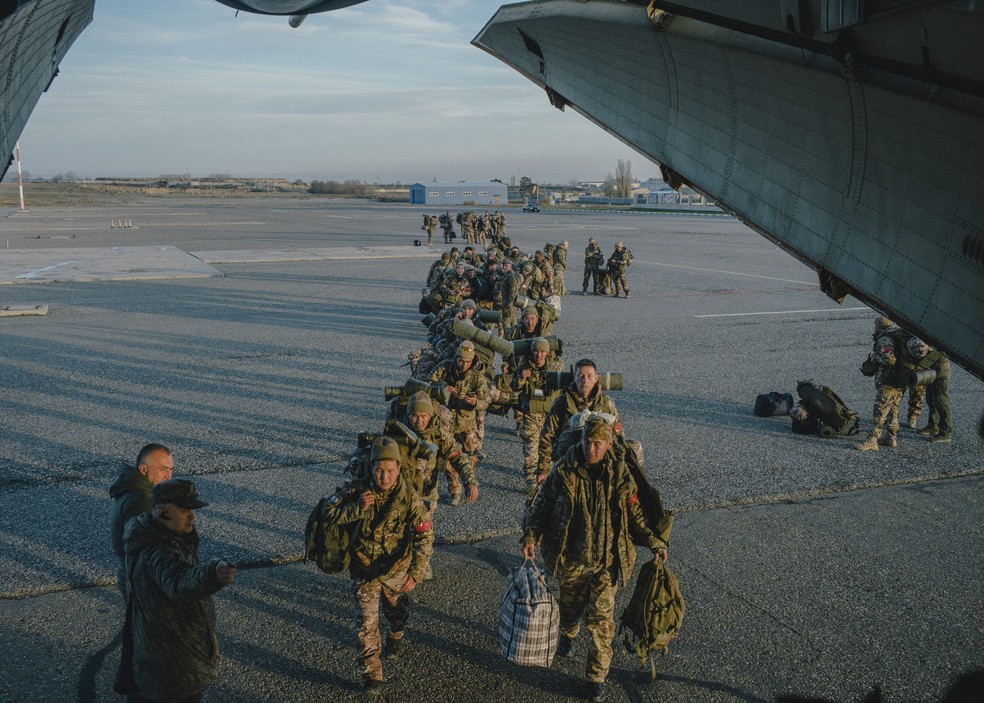 Soldados russos embarcam em aeronave militar no aeroporto de Grozny — Foto: Nanna Heitmann/The New York Times