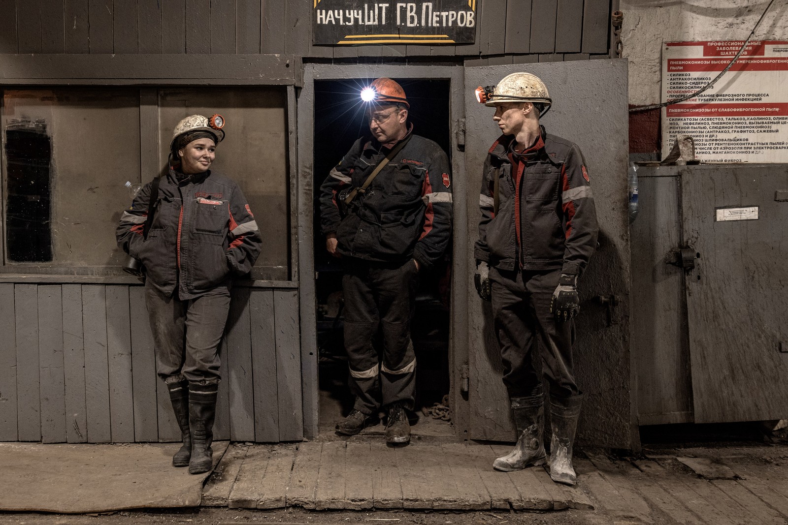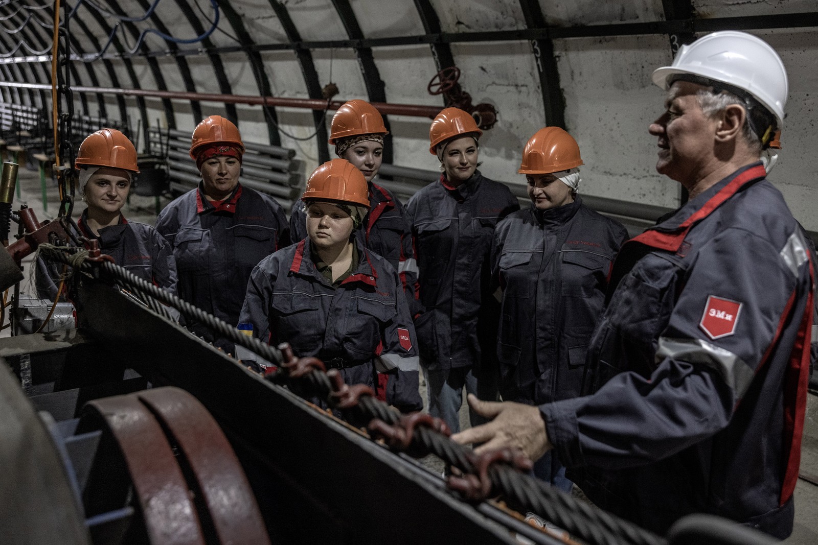 Uma geóloga espera com seus colegas para pegar um elevador de volta à superfície de uma mina perto da cidade de Pokrovsk,na região de Donetsk,no leste da Ucrânia — Foto: Finbarr O'Reilly/The New York Times