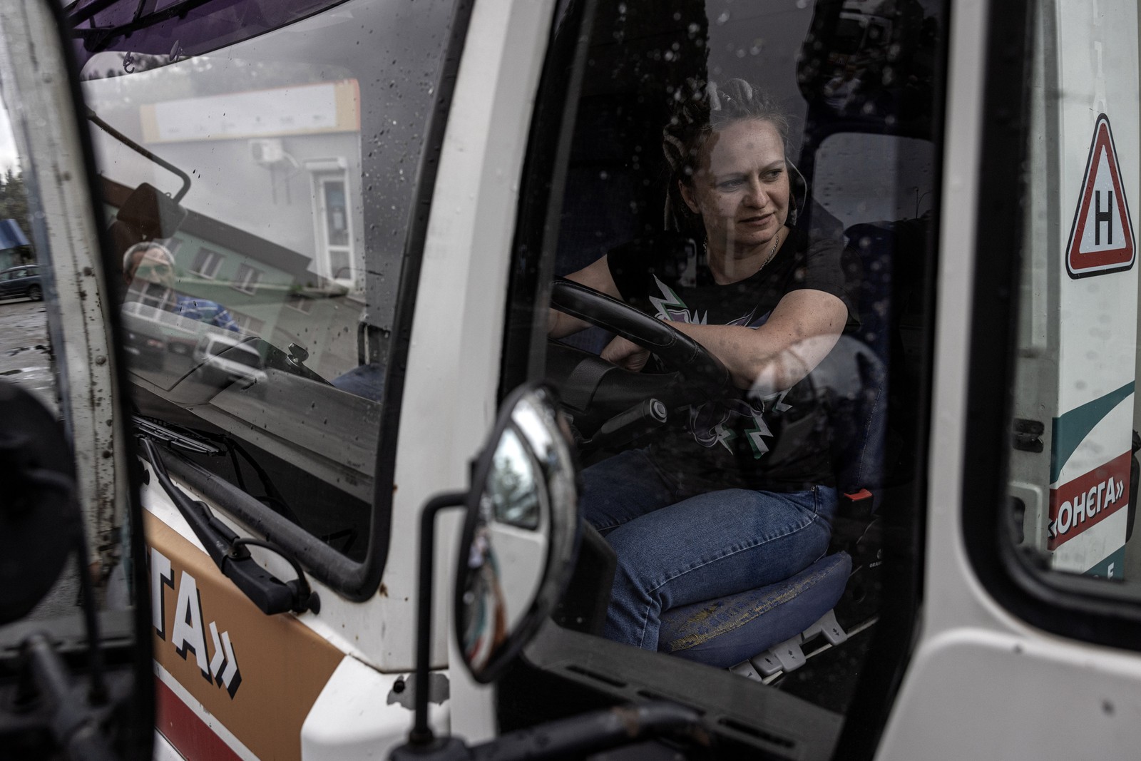 Olena Richko recebe aulas para se tornar motorista de caminhão,em Kiev,capital da Ucrânia — Foto: Finbarr O'Reilly/The New York Times