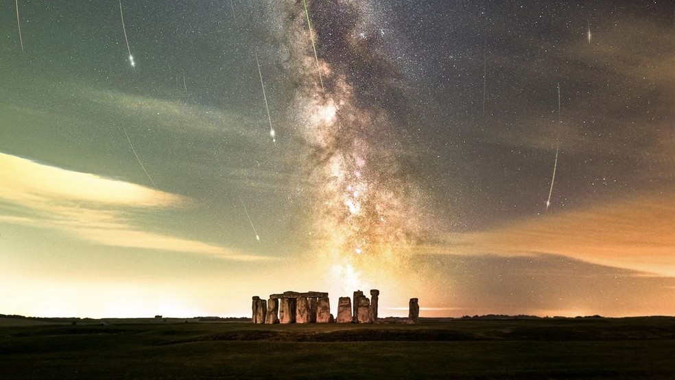 Uma composição de 43 exposições capturou a chuva de meteoros Perseidas em agosto,caindo sobre o icônico monumento Stonehenge.