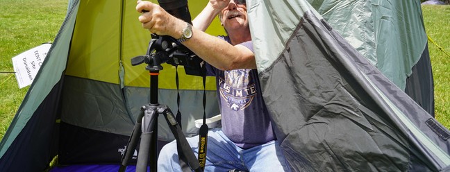 Um campista em Stonehenge II pratica com seu equipamento fotográfico antes do eclipse solar total na América do Norte,em Ingram,Texas. — Foto: Cécile Clocheret / AFP