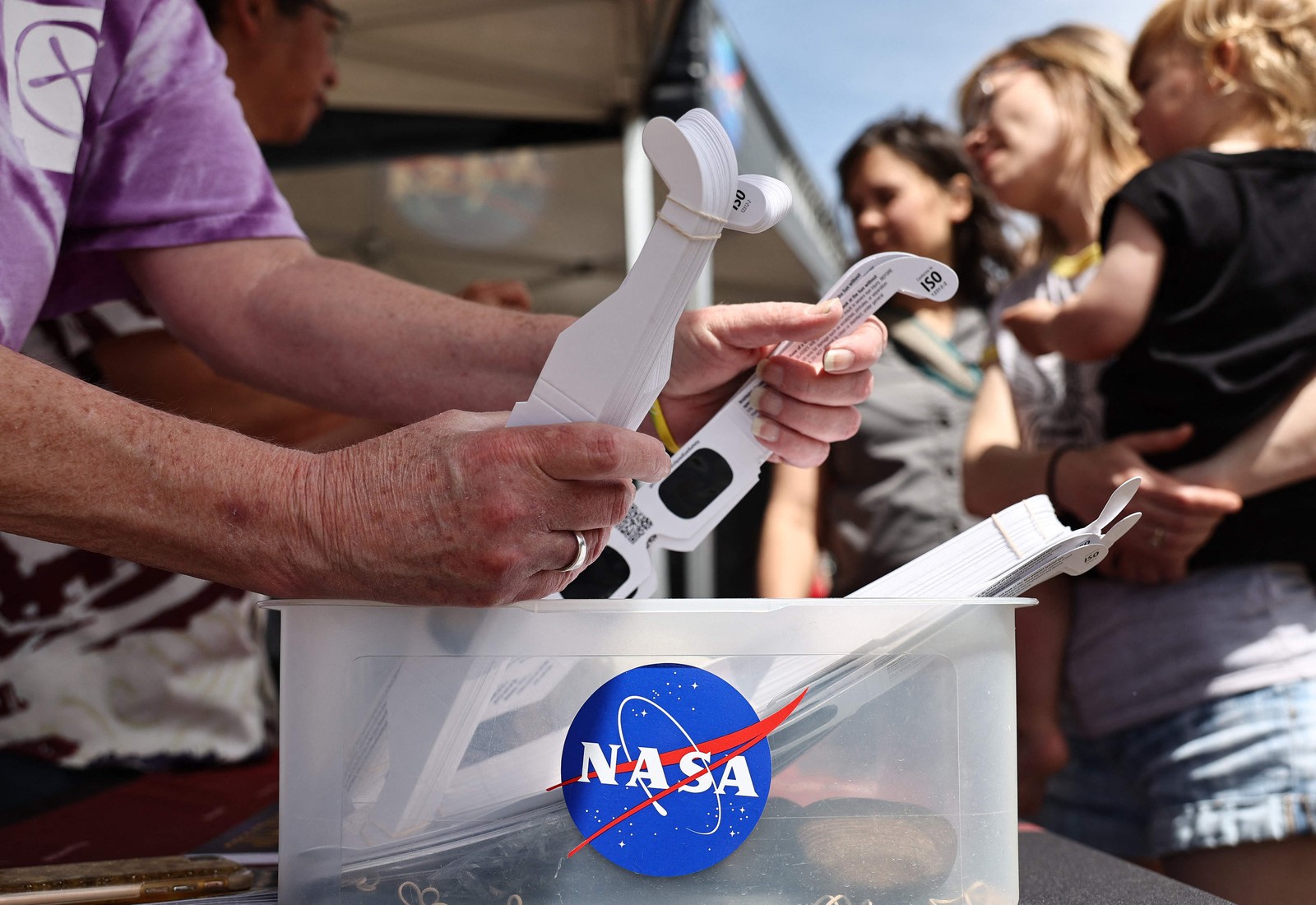 Óculos para eclipse solar gratuitos emitidos pela NASA são distribuídos. Comunidades de todo o país no caminho da totalidade do eclipse de 8 de Abril estão a realizar festivais e a preparar-se para receber um fluxo maciço de visitantes para ver o raro fenômeno celeste. — Foto: MARIO TAMA / GETTY IMAGES NORTH AMERICA / Getty Images via AFP