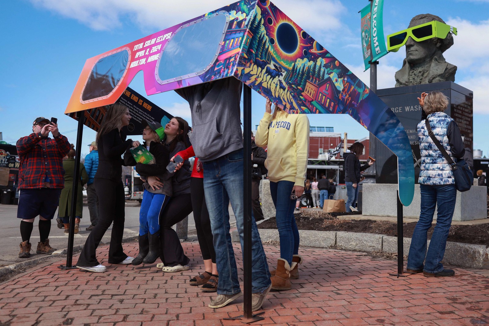 Visitantes olham através de um par de óculos gigante para eclipse montado na praça da cidade em Houlton,Maine. — Foto: Joe Raedle/Getty Images/AFP