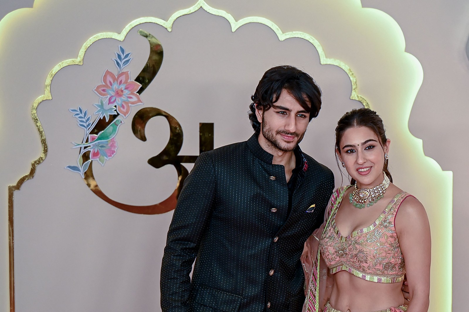 Sara Ali Khan e seu irmão,Ibrahim Ali Khan,chegaram para megacasamento na Índia — Foto: AFP